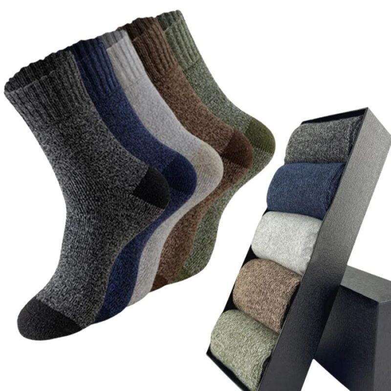 Este pack incluye 5 pares de calcetines térmicos tipo media alta para hombre, perfectos para combatir el frío. Están elaborados con mezcla de lana tipo Merino que conserva el calor natural sin que tus pies suden demasiado.