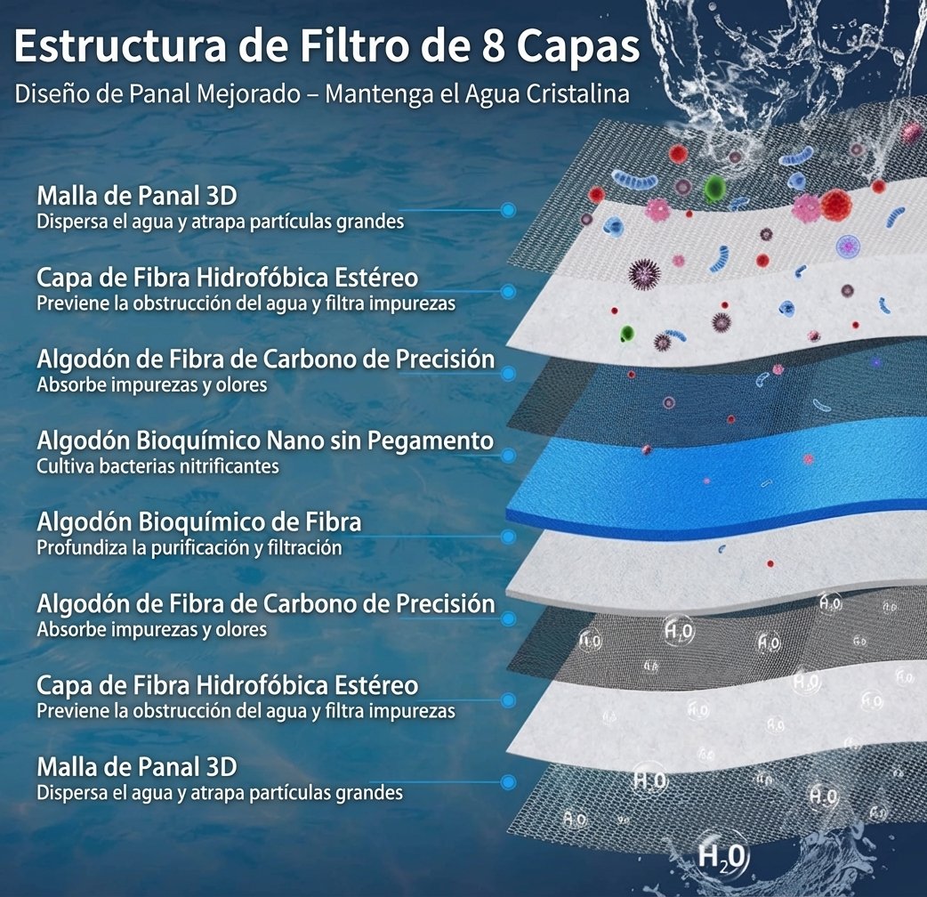 Beneficios para tu acuario: Mantiene el agua transparente, ayuda a eliminar partículas flotantes, protege a tus peces de impurezas y mejora el funcionamiento de tu filtro. Ideal para peceras de todos los tamaños, tanto de agua dulce como salada.