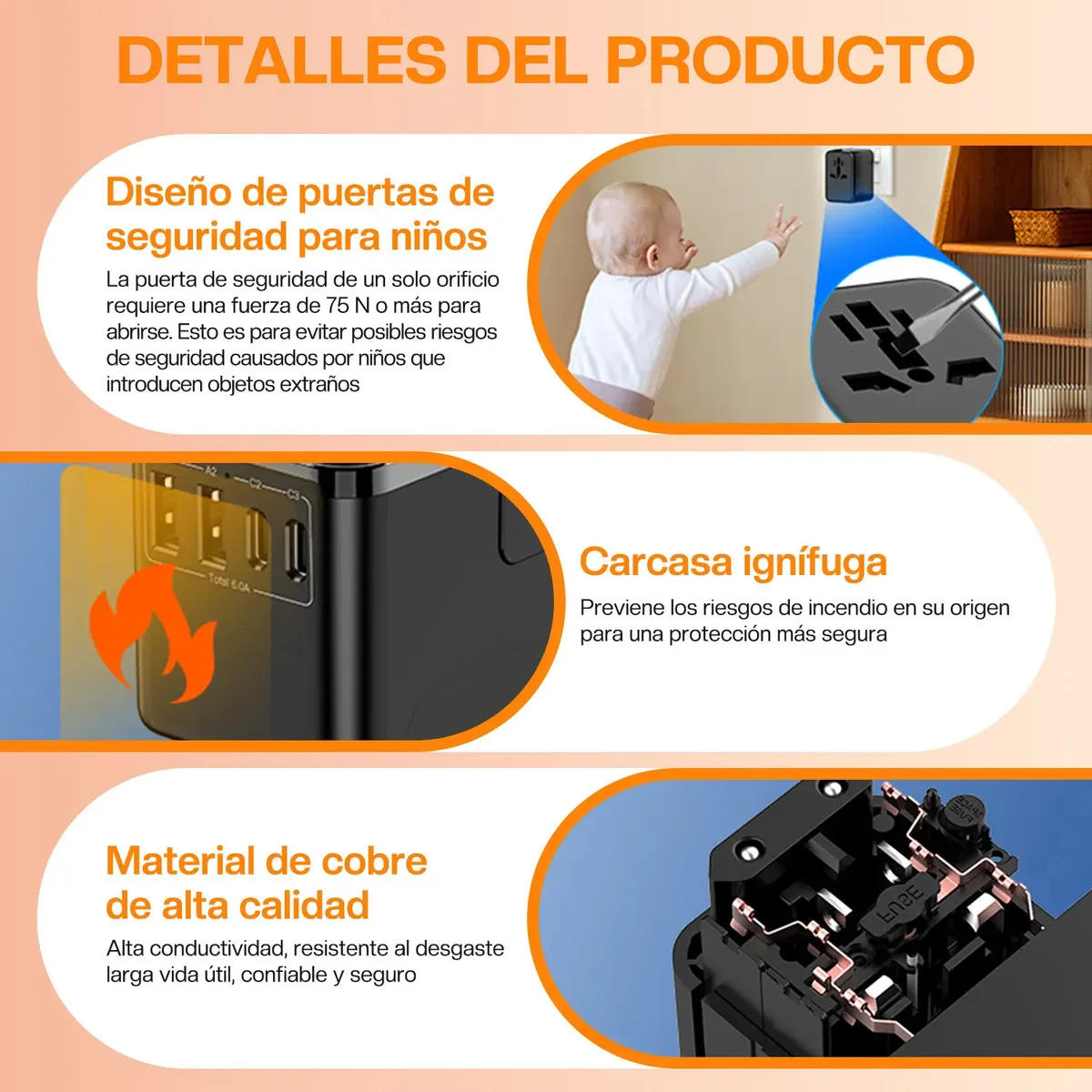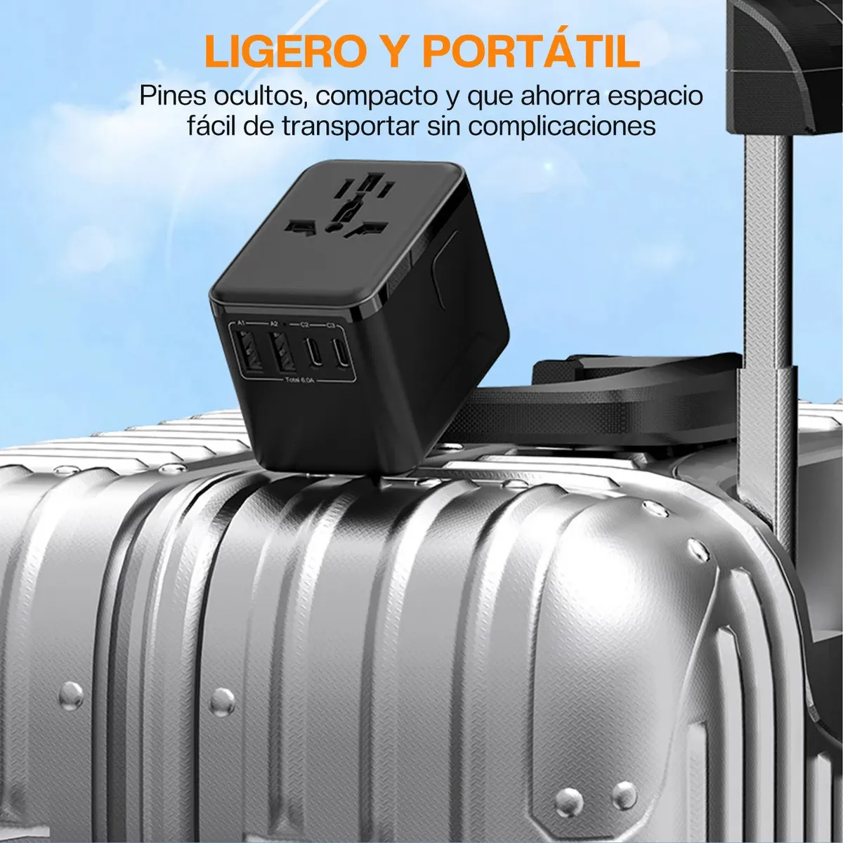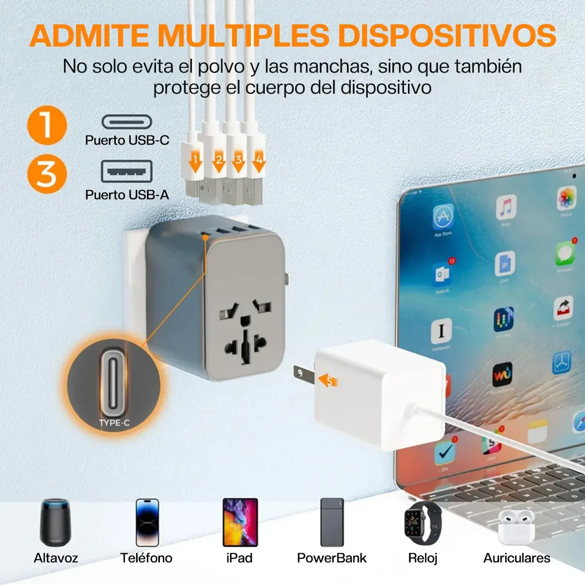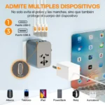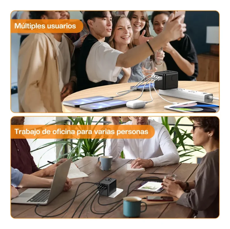 Perfecto para viajeros frecuentes, estudiantes en el extranjero o cualquier persona que necesite cargar celular, laptop, audífonos o tableta al mismo tiempo desde un solo adaptador.