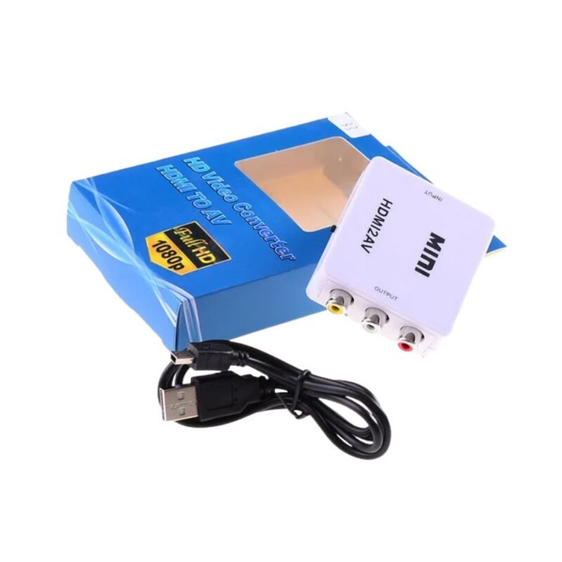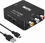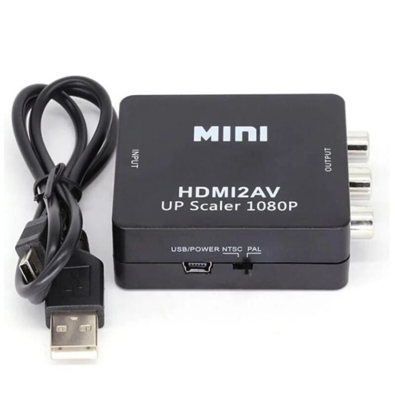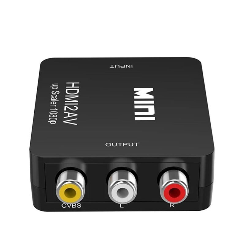 Este convertidor HDMI a RCA es la solución perfecta para conectar tus dispositivos modernos a televisiones o pantallas antiguas. Con diseño compacto en color negro, incluye cable USB para alimentación y tres salidas RCA identificadas por colores: amarillo (video), blanco y rojo (audio estéreo).