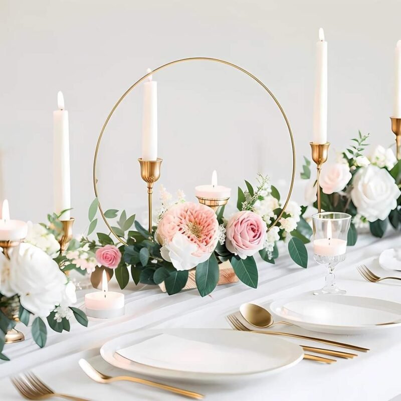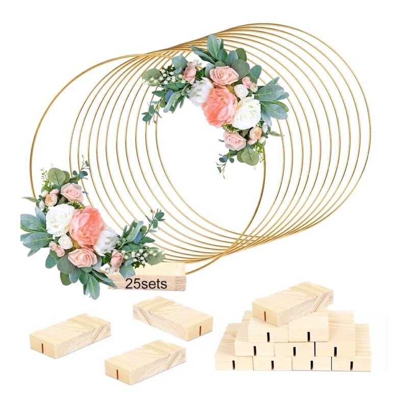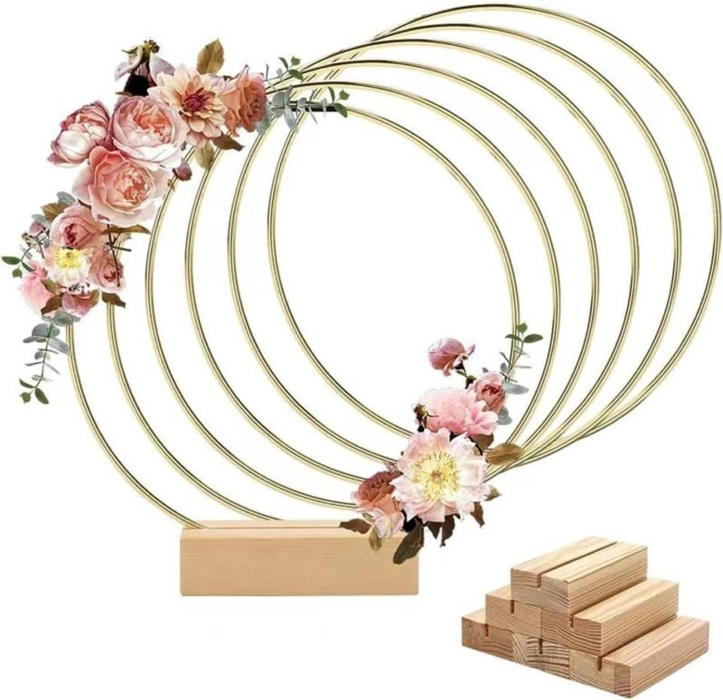 Transforma tus eventos con estos elegantes aros metálicos dorados, perfectos para crear centros de mesa y decoraciones espectaculares.