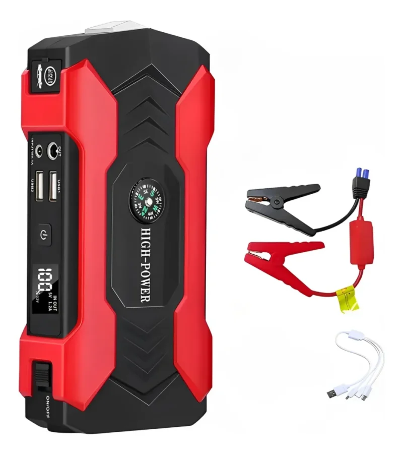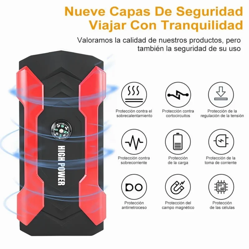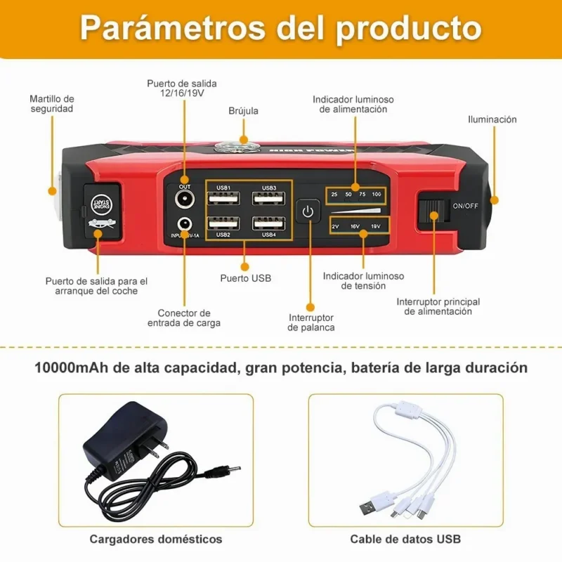 Arrancador de batería de 1000A: el arrancador de batería puede arrancar vehículos de 12 V en 1-3 segundos con corriente máxima de 1000 A y sujeción inteligente mejorada. Una carga completa puede arrancar coches, motocicletas, camiones, barcos, etc., especialmente vehículos pesados (hasta 7.0L de gasolina/motor diesel de 5.5L) Carga conveniente: el banco de energía móvil de gran capacidad de 28000 mAh puede cargar de forma rápida y segura su teléfono y tableta al mismo tiempo. Opere 30 veces con una carga completa y arranque rápido en automóviles, motocicletas, camiones, barcos y más. (Carga completa en 6 horas) -Sistemas de protección inteligente: las pinzas inteligentes con 8 protecciones, que incluyen protección contra fallas, sobrecorriente, sobrecarga, sobretensión, sobrecalentamiento, descarga y polaridad inversa. Martillo de seguridad: en peligro, los clavos de acero inoxidable pueden romper las ventanas. Nuestros arrancadores de coche son lo suficientemente pequeños y ligeros como para caber en la guantera y en cualquier rincón pequeño del coche. Teléfono móvil con interfaz 4USB/banco de energía digital Gran capacidad de 28000 mAh Batería de larga duración, interfaz de entrada de carga 15 V/1 A carga más rápida características: 1.La celda de la batería está especialmente diseñada para el arranque del automóvil, la corriente es estable, la eficiencia de carga es alta y la vida útil es larga.Puede soportar el fuerte impacto de la corriente en el momento del arranque del automóvil. 2.Batería de polímero de litio de alta velocidad, arranque fuerte 3.El IC de administración de energía inteligente es estable y seguro, y no dañará el automóvil ni el equipo digital 4.Tratamiento de capa de aislamiento térmico a prueba de explosiones de seguridad, resistencia a altas temperaturas Arranque el vehículo en cuatro sencillos pasos: 1.Inserte la interfaz del clip de cableado en el puerto de inicio de energía. 2.Conecte el clip rojo al polo positivo de la batería del automóvil, el clip negro al polo negativo de la batería del automóvil y encienda el interruptor de alimentación principal. 3.Regrese al automóvil y enciéndalo. 4.Retire el clip después de que se complete el inicio. ***INFORMACIÓN PARA SU COMPRA*** 1.¿Tienes más dudas o comentarios? Realiza tu consulta en la sección de preguntas, estamos a tus órdenes y responderemos con gusto cualquier duda a la brevedad 2.¿Por qué comprar con nosotros? Nuestros productos se envían de inmediato. Están en el almacén de Mercadolibre por lo que es el envío más veloz y seguro que existe. ¡Gracias por tu preferencia, estamos para servirte! 3.Si el paquete presenta maltrato al llegar, no lo reciba y devuelvalo ya que no cubrirá garantía en caso de que la paquetería haya sido la responsable del maltrato del producto. 4.Para saber la fecha estimada de entrega abajo del precio puede ver qué día le va a llegar, en caso de que no lo vea en la parte donde dice calcular cuando llega y al poner su código postal vera la fecha estimada de llegada, los envíos pueden tardar de 1 a 4 días hábiles y dependerá de la zona a donde sea recibido. 5.El envío es por MercadoEnvios, es decir que MercadoLibre es quien gestiona los envíos y este podrá ver en el detalle de su compra la fecha estimada de llegada y en que estatus esta su compra, la paquetera la elige MercadoLibre dependiendo del mejor método y más rápido para su destino. 6.Si tiene alguna pregunta sobre el producto, no dude en ponerse en contacto con nosotros. No es necesario presentar una reclamación. Por favor, póngase en contacto con nosotros sobre el problema post-venta y nos ocuparemos de él tan pronto como sea posible. Garantía del vendedor: 30 días