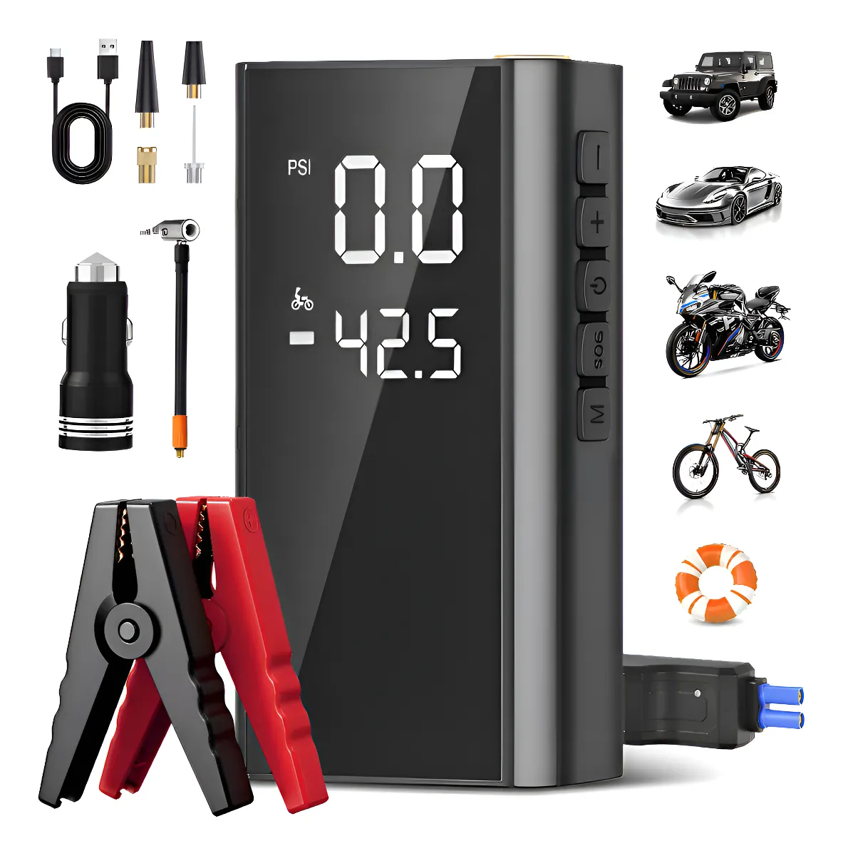 Con una potencia máxima de 7500 A y una capacidad de 20000 mAh, puede arrancar de forma fácil y segura SUV, camiones, furgonetas, cortacéspedes, motos de nieve, motocicletas, yates, etc.