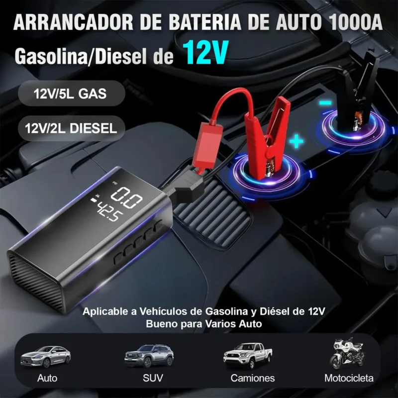 Este arrancador de batería para coche está diseñado para vehículos de gran cilindrada (apta para todos los vehículos de gasolina de 5.0 L y diésel de 2 L).