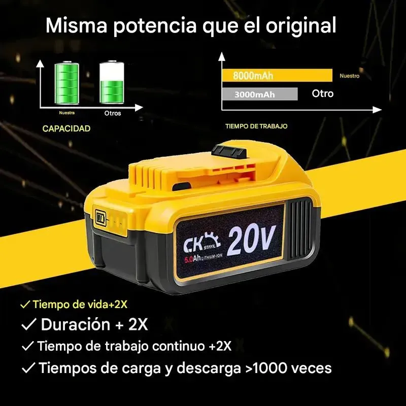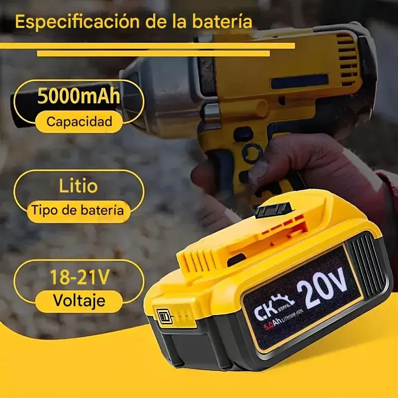 Esta batería de alto rendimiento es apta para herramientas eléctricas como llaves, taladros y sierras inalámbricas, secadores de pelo y ventiladores eléctricos. Se carga más rápido y dura más que otras baterías del mercado. También incluye un indicador de batería para ofrecer una vista dinámica del estado de carga y el uso de la batería.