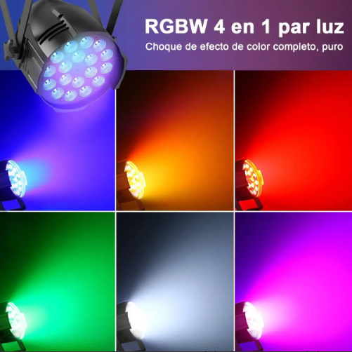 Esta luz par led es perfecta para darle vida a cualquier evento, antro, disco, boda o fiesta. Con 18 leds de 18 watts cada uno y tecnologia 6 en 1 RGBWAP, obtienes una mezcla de colores increible desde un solo foco.