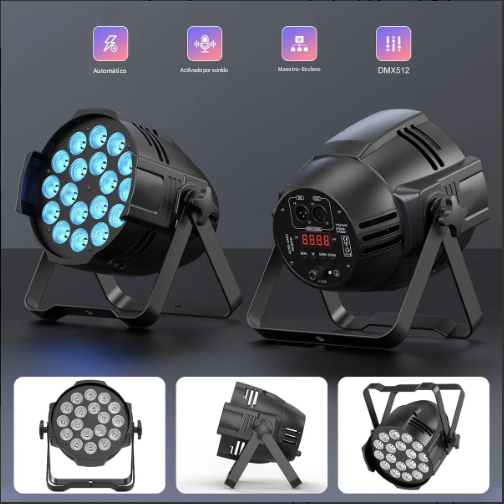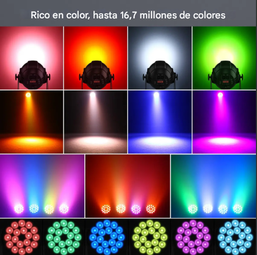 - 18 leds de 18 watts con colores rojo, verde, azul, blanco, ambar y ultravioleta