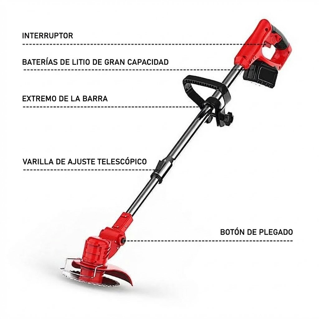 Desbrozadora inalámbrica profesional ideal para mantener tu jardín, patio o terreno en perfecto estado sin cables ni gasolina.
