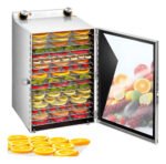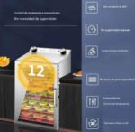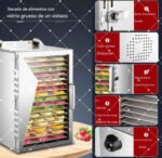 Este deshidratador de alimentos cuenta con 18 bandejas de acero inoxidable, ideal para preparar frutas, verduras, carnes y más. Su diseño moderno y resistente lo hace perfecto para uso doméstico o semi-industrial.