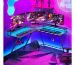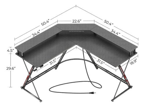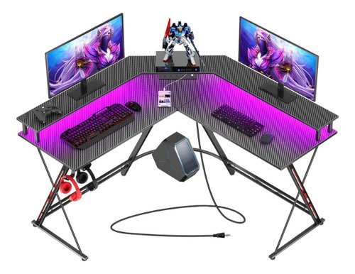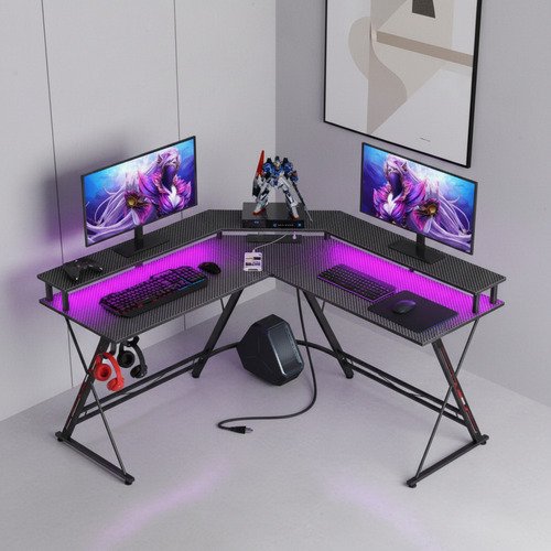 Gaming Desk with Charging Station The L-shaped gaming desk includes a built-in outlet with 4 sockets and 2 USB ports for smartphones, tablets or gaming devices. Cool Smart LED Light LED light offers u