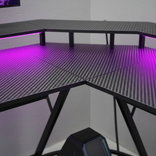 Fabricado con materiales de alta calidad como fibra de carbono y metal, este escritorio no solo es resistente, sino que también soporta hasta 80 kg, garantizando estabilidad y durabilidad. Las luces LED integradas añaden un toque dinámico a tu setup, creando un ambiente envolvente que realza tu experiencia de juego.