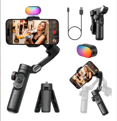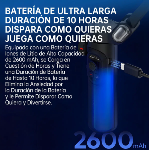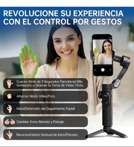 - Incluye: gimbal, luz LED, cable de carga y mini tripie