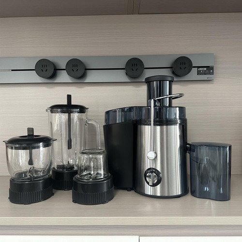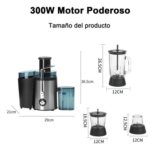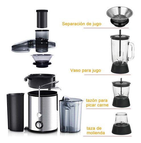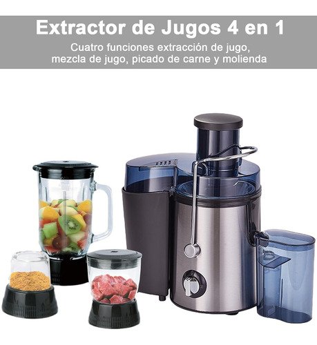 Incluye extractor de jugos, licuadora y moledor, ideal para preparar jugos, batidos y moler ingredientes secos.
