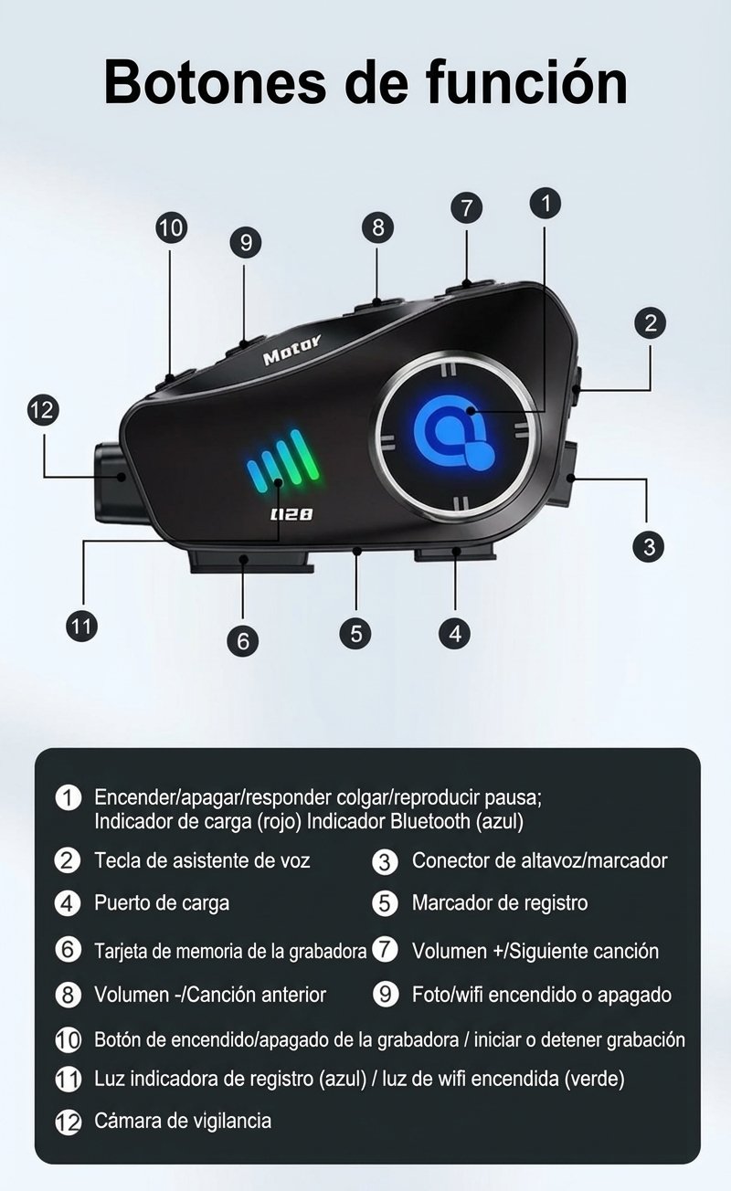 Este dispositivo todo en uno se monta fácilmente en tu casco de moto y combina una cámara de video con audífonos Bluetooth inalámbricos. Diseño compacto en color negro con detalles de luces LED de colores (verde, azul y rojo) que le dan un toque moderno.