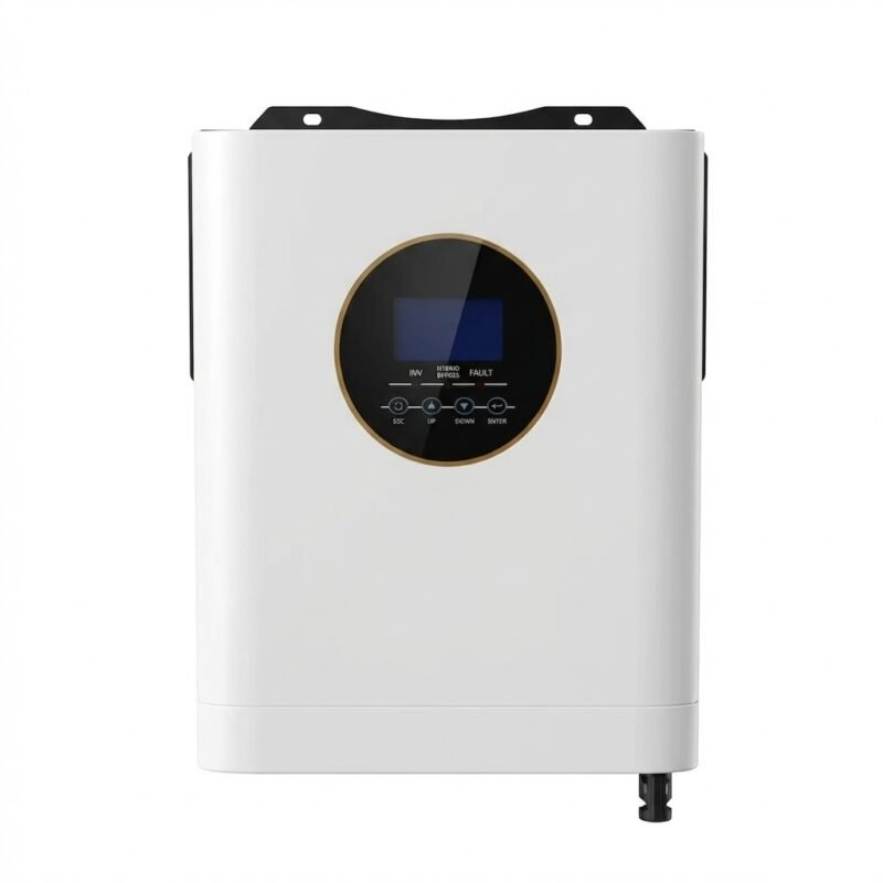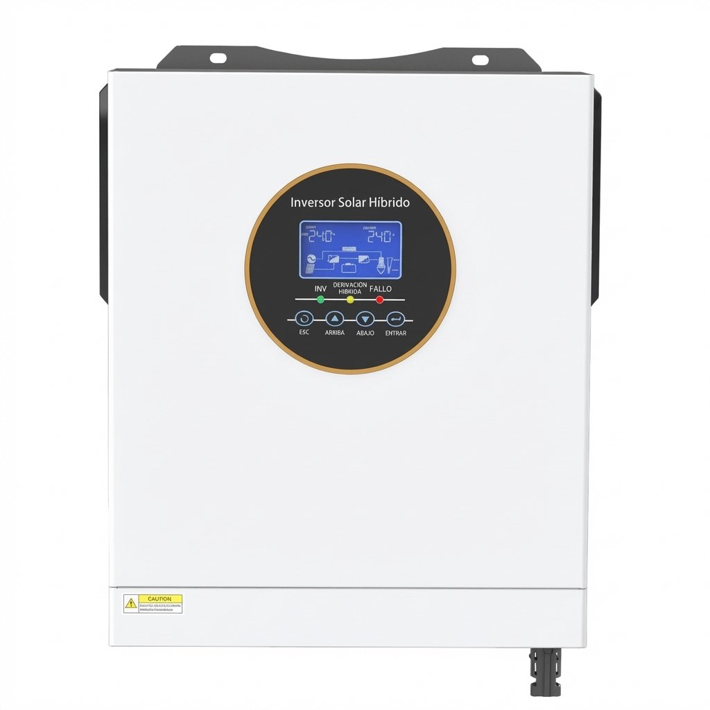 Este inversor solar híbrido es perfecto para tu casa o negocio en México. Con su diseño compacto en color blanco y acabados modernos, incluye una pantalla digital azul con controles intuitivos que te permiten monitorear fácilmente tu sistema solar.