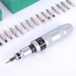 • Desarmador de impacto color plateado y negro con empuñadura ergonómica
