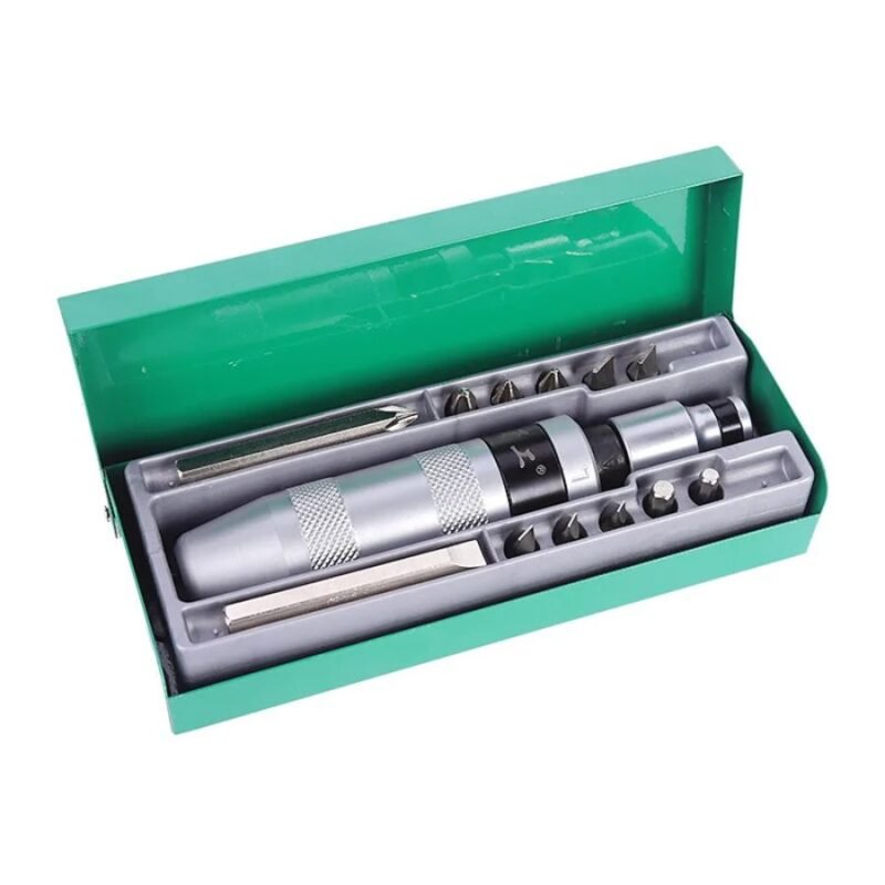 Este set de 14 piezas es la solución perfecta cuando tienes tornillos atorados, barridos o con la cabeza dañada. Incluye un desarmador de impacto con múltiples puntas extractoras que te sacan de apuros en cualquier reparación.