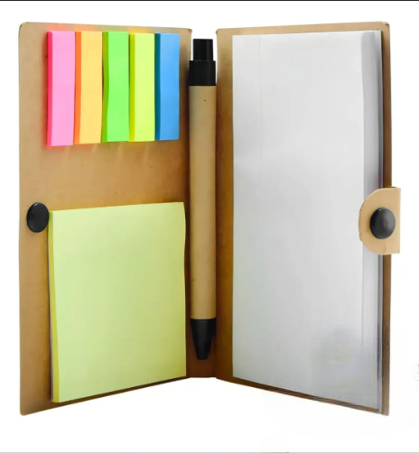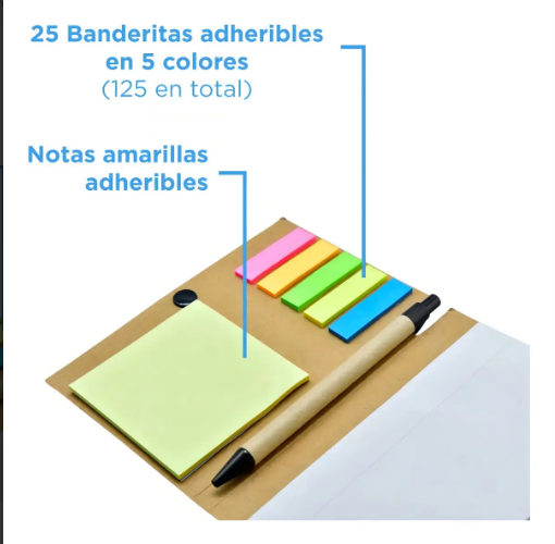 Este set de libreta con notas adhesivas es ideal para mantener tus ideas organizadas en la oficina, la escuela o en casa. Viene con todo lo que necesitas para tomar apuntes de forma practica y ordenada.