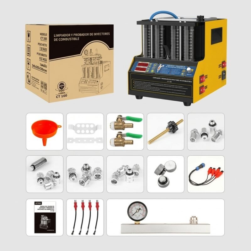 El CT160 de AUTOOL es un equipo profesional color amarillo y negro diseñado para limpiar y probar inyectores de gasolina de tu auto. Este limpiador utiliza tecnología ultrasónica para eliminar depósitos de carbón y suciedad que afectan el rendimiento de tu motor.