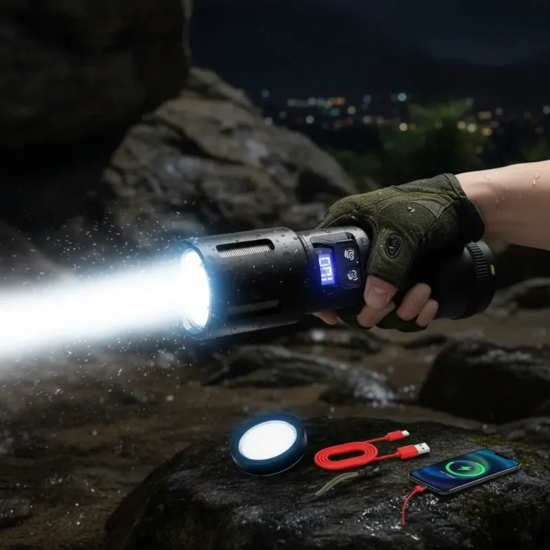 La linterna de emergencia puede cargar tu teléfono móvil, reloj inteligente u otros dispositivos con alimentación USB en un instante. Ya sea que te encuentres varado en la naturaleza o durante un apagón, esta linterna te mantiene conectado.