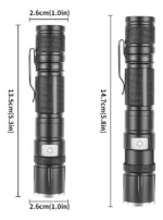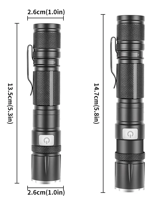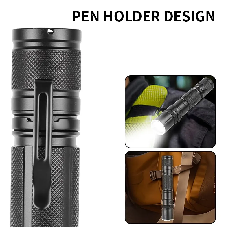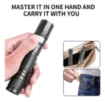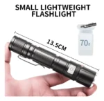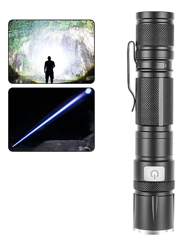 Compacta y potente, ilumina tus aventuras. Fabricada en aleación de aluminio aeronáutico, esta linterna de solo 70 gramos y 13.5 cm de longitud. Cuenta con un práctico clip para llevarla en la mochila o el bolsillo, convirtiéndose en tu compañera ideal para excursiones y emergencias. Características principales: tecnología láser blanco de alto rendimiento (600-800 lúmenes) con alcance de hasta 800 metros 5 modos de iluminación (alta/media/baja, estroboscópico y SOS), para adaptarse a cualquier situación ZOOM ajustable (foco amplio o concentrado).