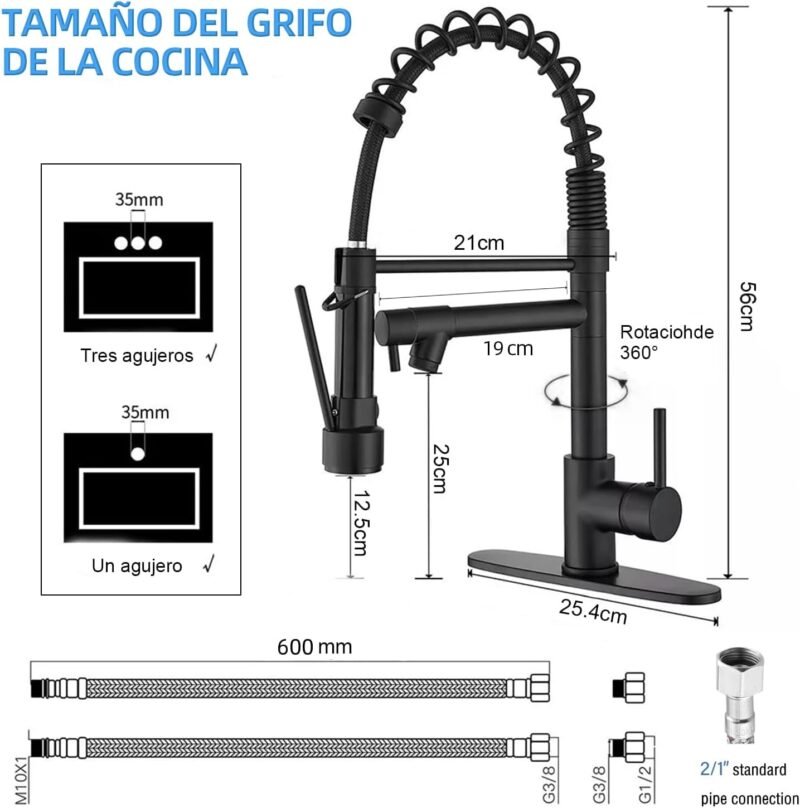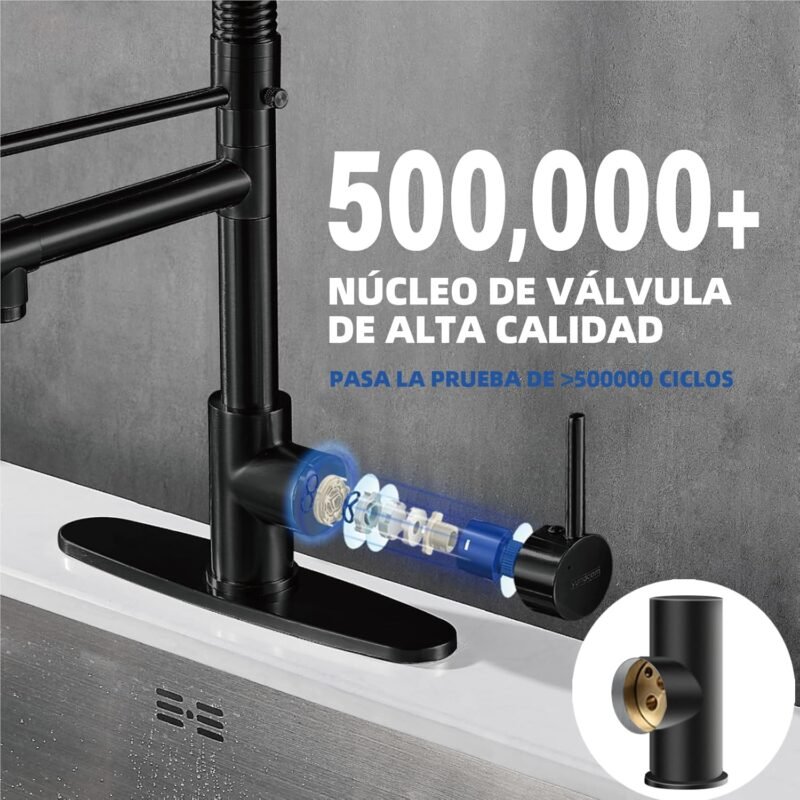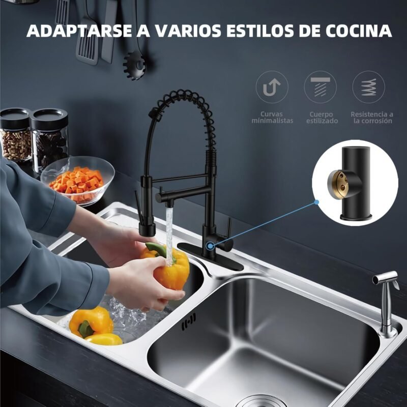 Esta llave de cocina es perfecta para facilitar el lavado diario de trastes, frutas y verduras. Gracias a su manguera retráctil con resorte, puedes jalar el chorro hasta donde necesitas sin esfuerzo y regresa sola a su lugar.