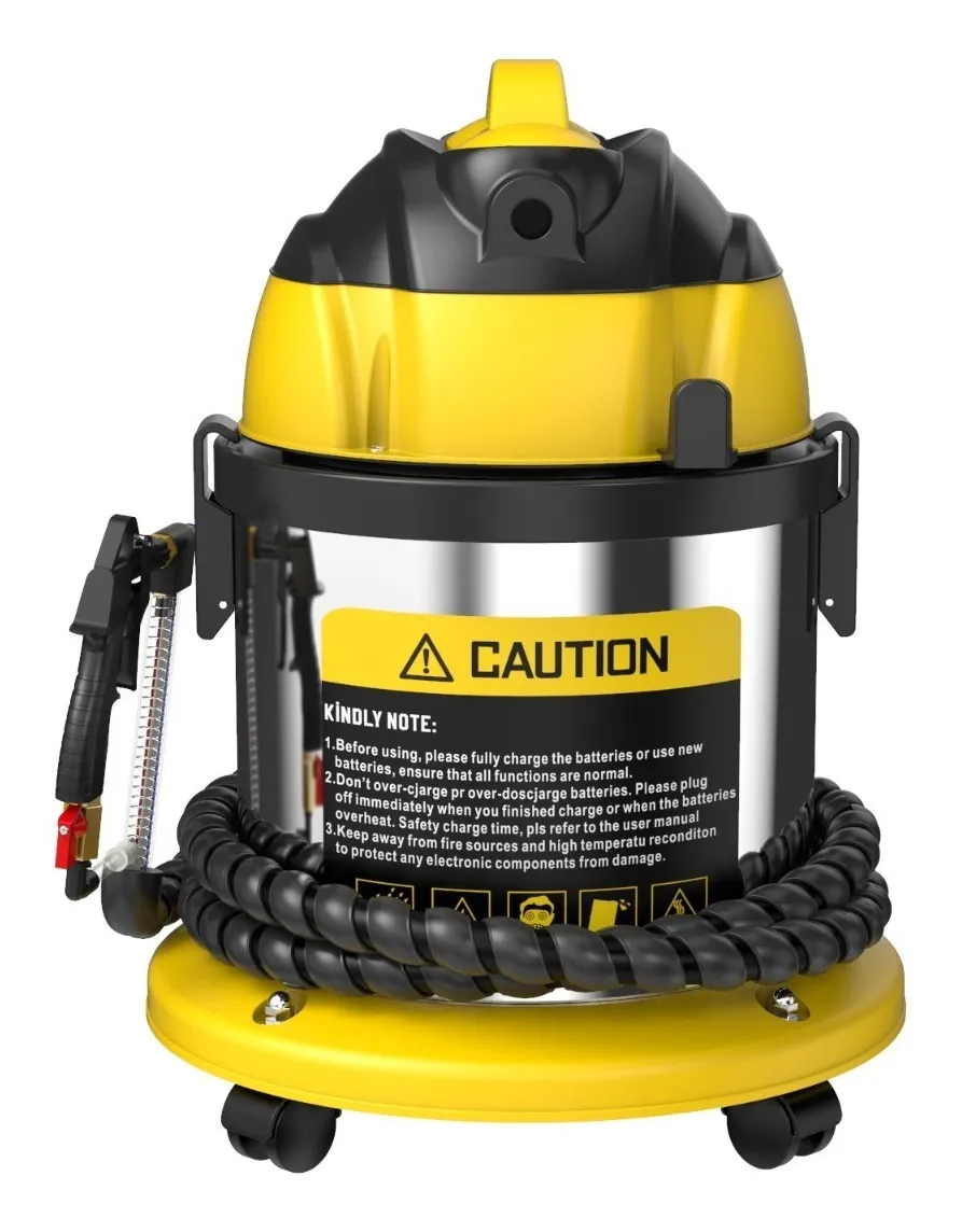 Esta aspiradora industrial de 20 litros de capacidad está diseñada para trabajos pesados en talleres mecánicos, limpieza automotriz y uso profesional. Su diseño robusto en color amarillo y plateado con tanque de acero inoxidable garantiza durabilidad y resistencia.