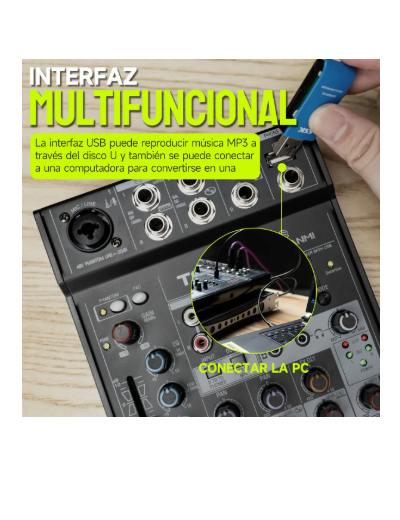 - 4 canales de audio para conectar microfonos e instrumentos