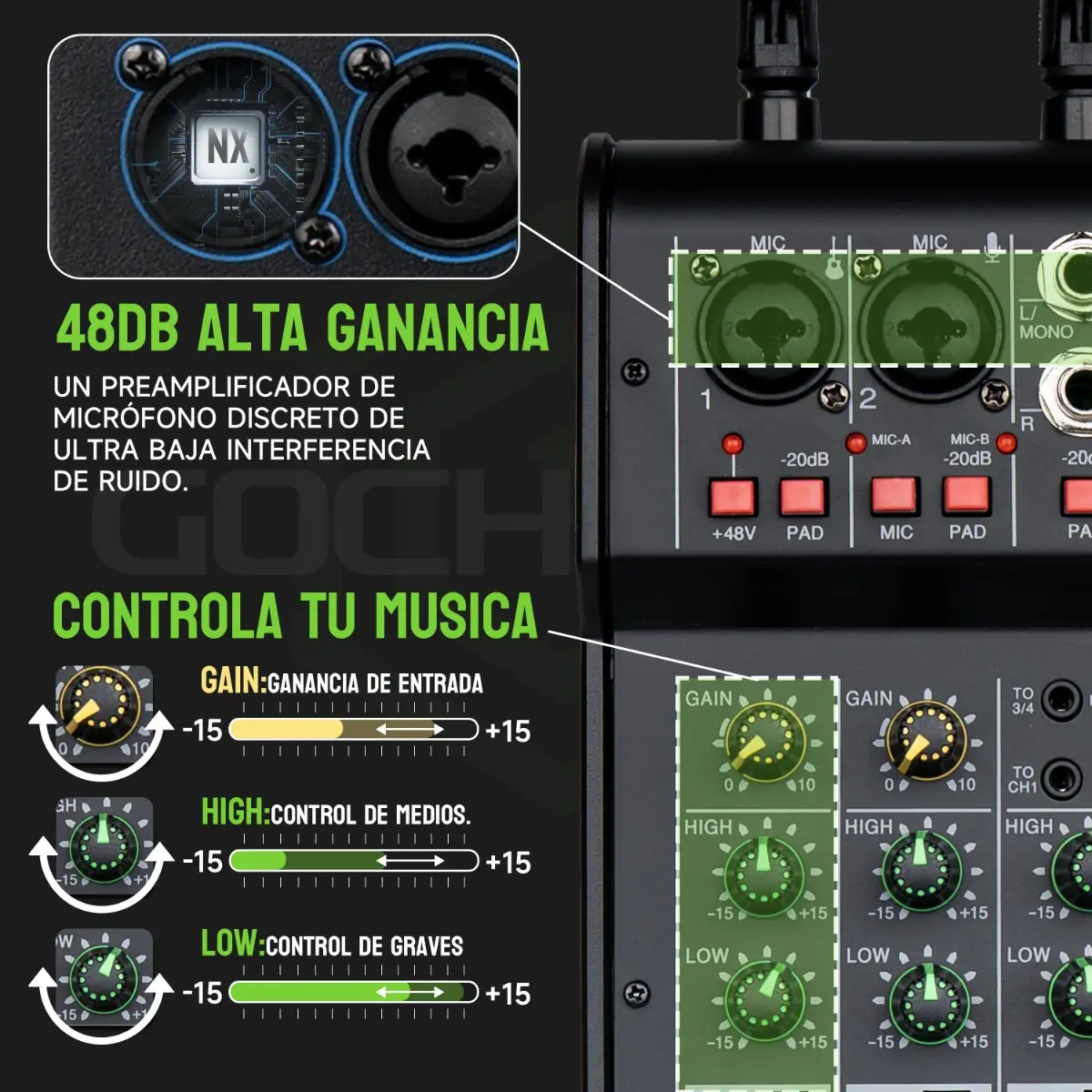 - Control de GAIN, HIGH y LOW por canal para ajustar el sonido a tu gusto