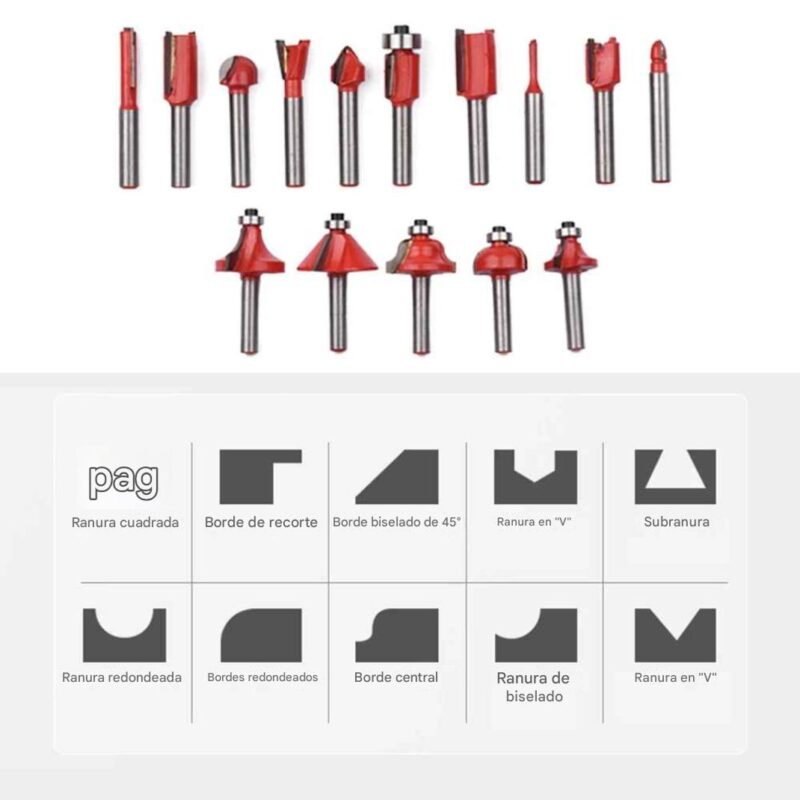- 12 brocas de diferentes formas y tamaños con puntas rojas