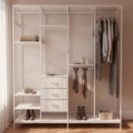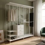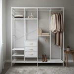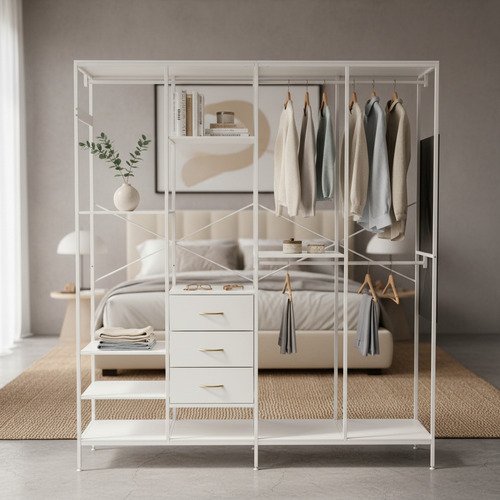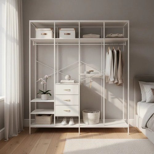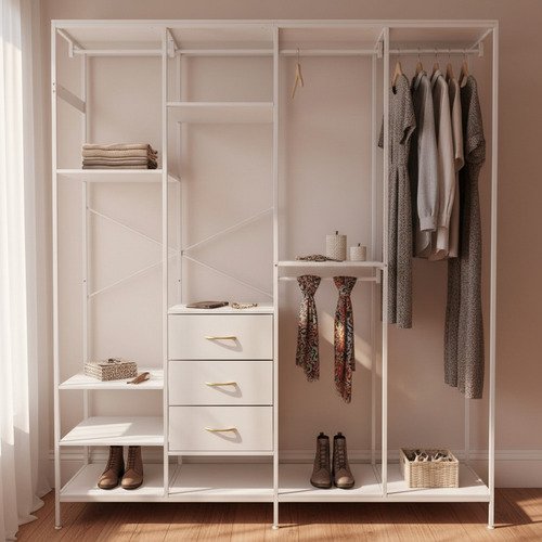 Organiza tu espacio con este ropero abierto metálico, ideal para dormitorios modernos y funcionales. Su diseño abierto permite fácil acceso a tus prendas y accesorios, mientras que los cajones y estantes ofrecen almacenamiento adicional.
