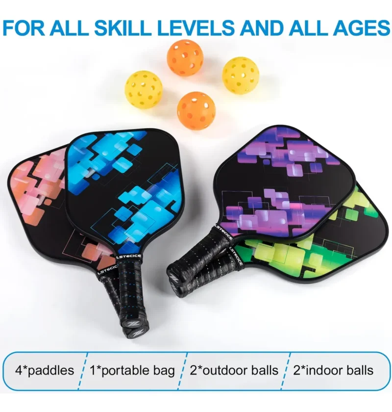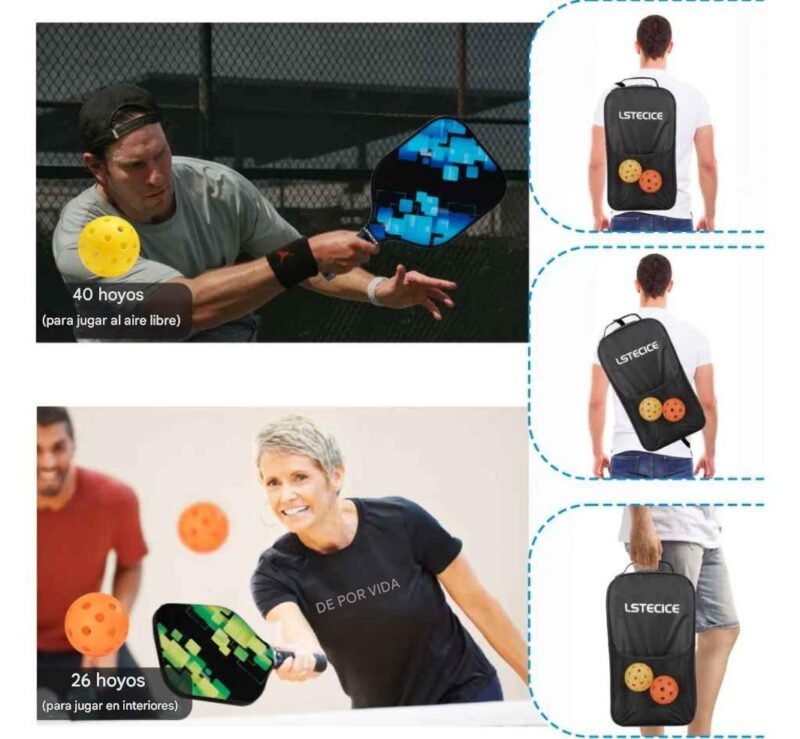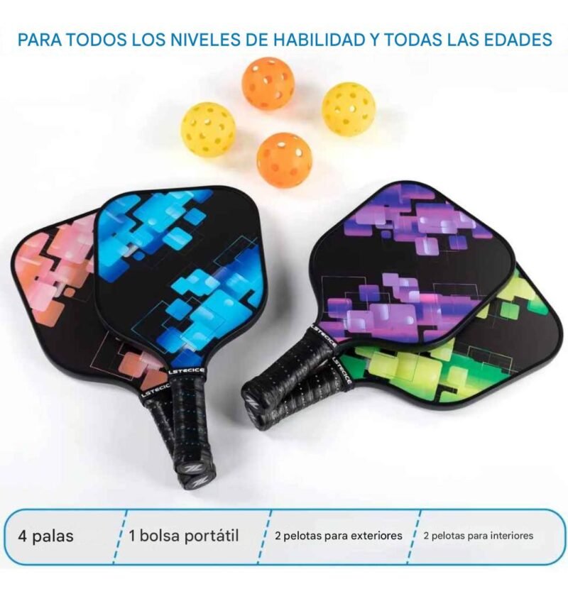 Este set de pickleball trae todo lo que necesitas para jugar desde el primer día. Incluye 4 raquetas, 4 pelotas y una bolsa de transporte para que puedas llevarlo a donde quieras sin complicaciones.