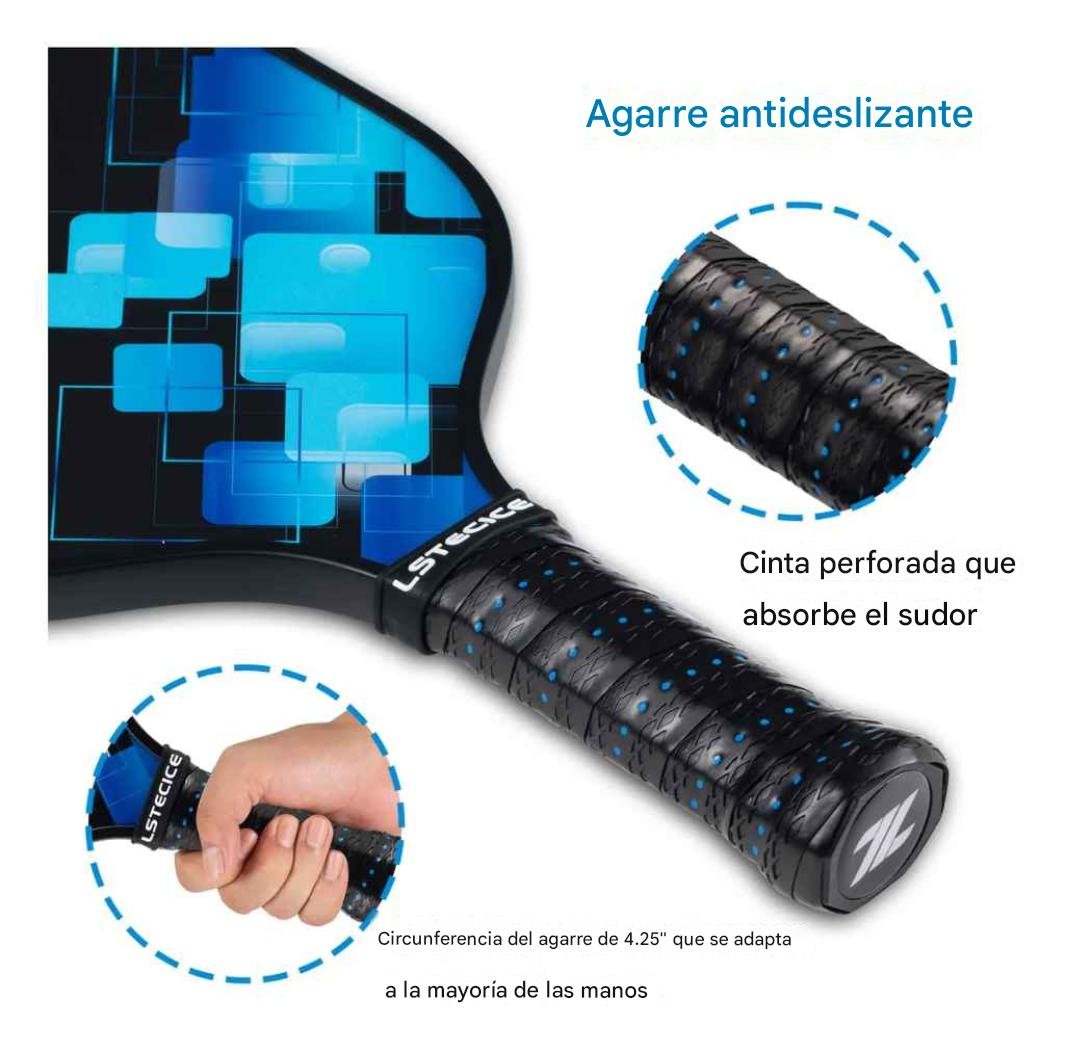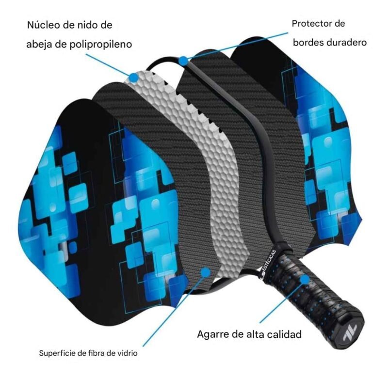 Las raquetas tienen un nucleo de panal de abeja que absorbe la vibracion y protege la muneca, haciendo el juego mas comodo para todos los niveles.