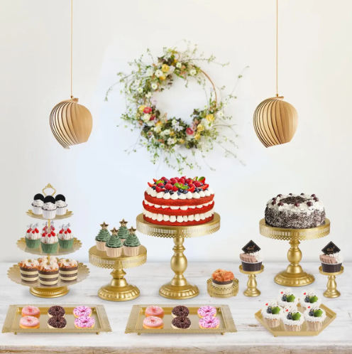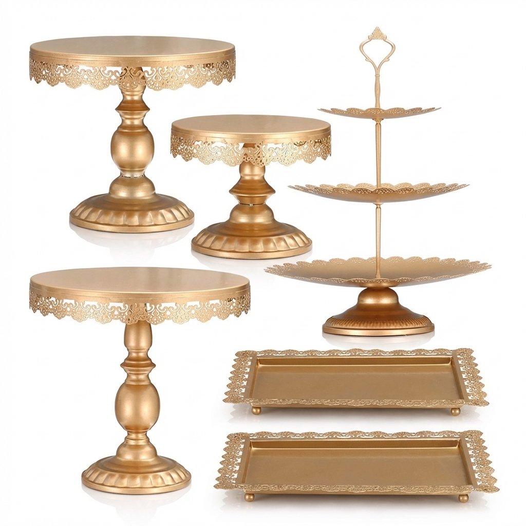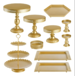 Dale un toque elegante y sofisticado a tu mesa de dulces con este increíble set de 8 piezas en color dorado. Perfecto para bodas, XV años, bautizos o cualquier celebración especial.