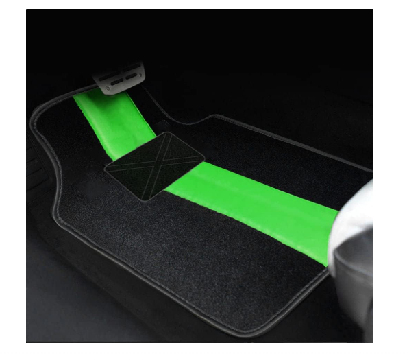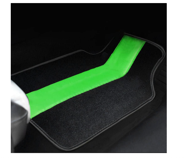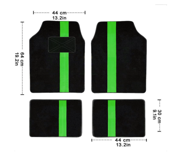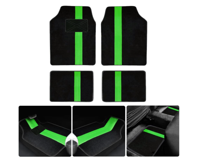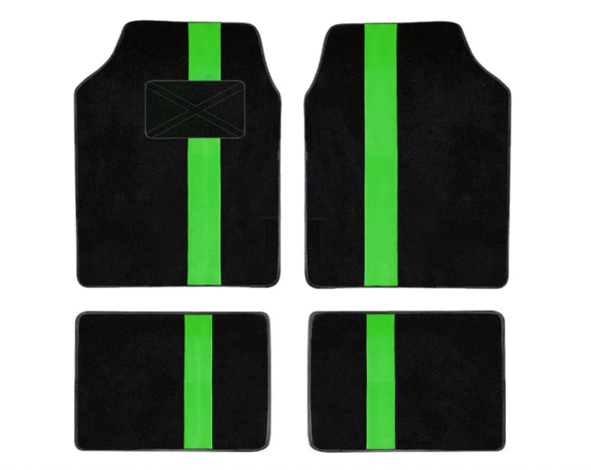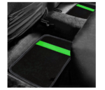 Este set trae 4 tapetes completos para los asientos delanteros y traseros de tu auto. Su diseño en negro con franja verde neón los hace ver muy padres y modernos, ideales si quieres darle personalidad a tu vehículo.
