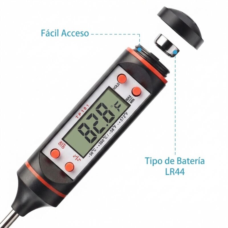 Este termómetro digital es perfecto para cocinar carnes, asar en parrilla y preparar tus alimentos favoritos con la temperatura exacta. Viene en dos colores disponibles: negro y blanco/rojo, con diseño práctico y compacto.