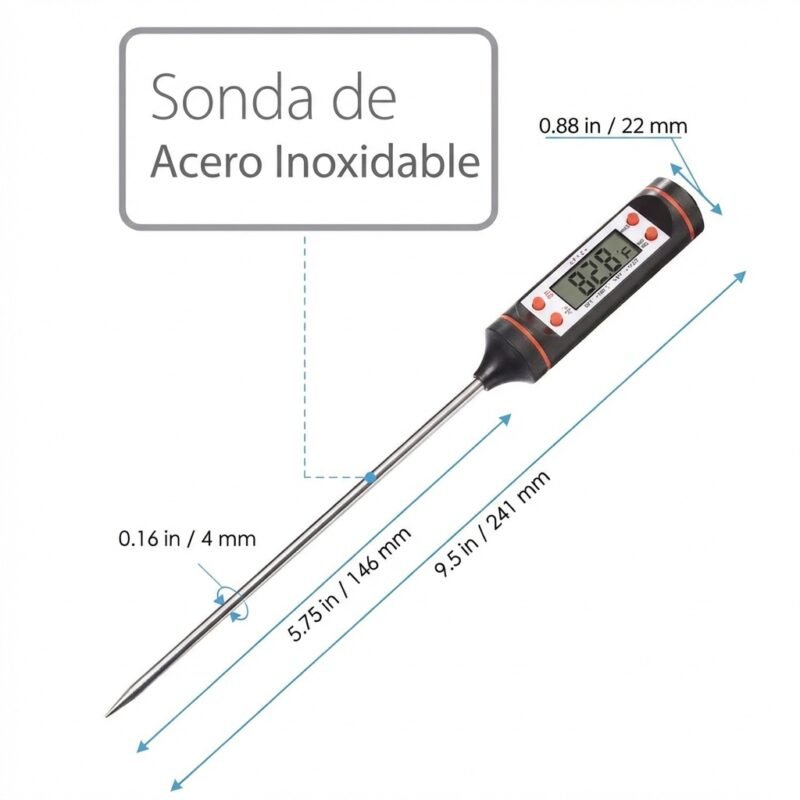Con este termómetro te aseguras de que tus carnes queden en su punto perfecto, jugosas y bien cocidas. Es una herramienta indispensable para cualquier persona que disfrute cocinar y hacer parrilladas.
