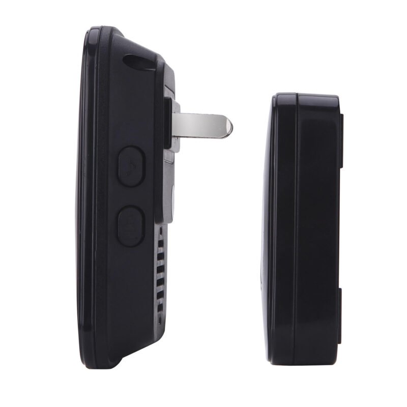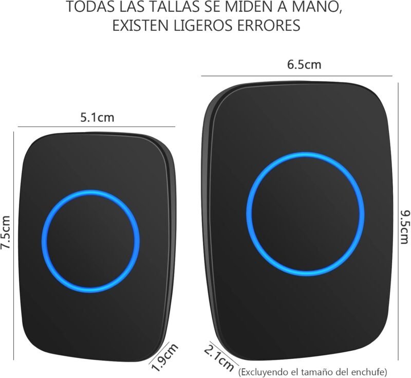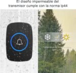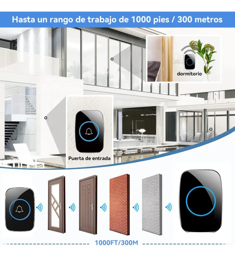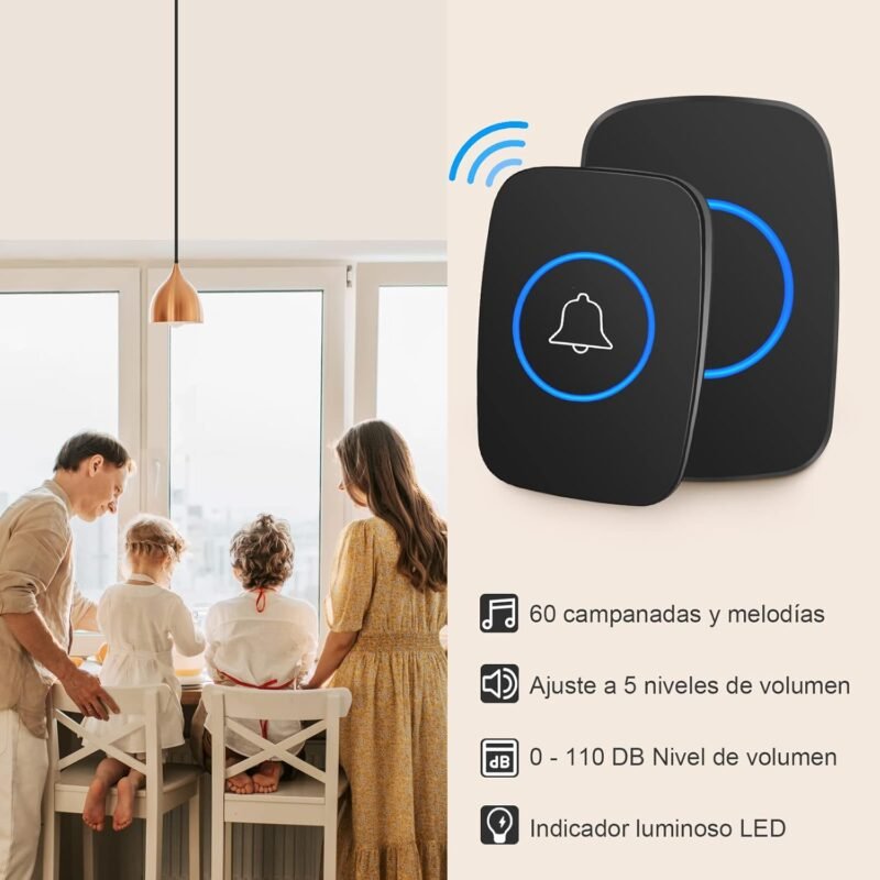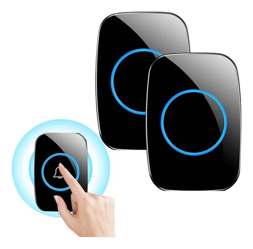 Este moderno timbre inalámbrico te permite saber cuándo llegan visitas sin necesidad de cables complicados. El set incluye dos unidades con diseño elegante en color negro con detalles azules iluminados.