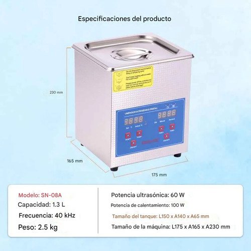 Tina de ultrasonido digital fabricada en acero inoxidable, ideal para limpieza profunda de piezas, herramientas, joyería y componentes electrónicos. Cuenta con panel de control digital para ajustar tiempo y temperatura, así como tapa y canastilla metálica para mayor seguridad y comodidad.