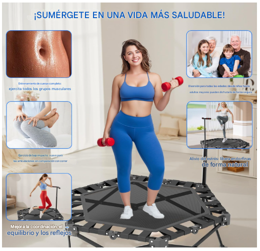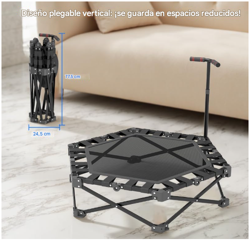 Esta cama elástica compacta es perfecta para hacer ejercicio en casa sin necesidad de mucho espacio. Gracias a su diseño hexagonal y su estructura plegable, puedes guardarla fácilmente cuando no la uses.